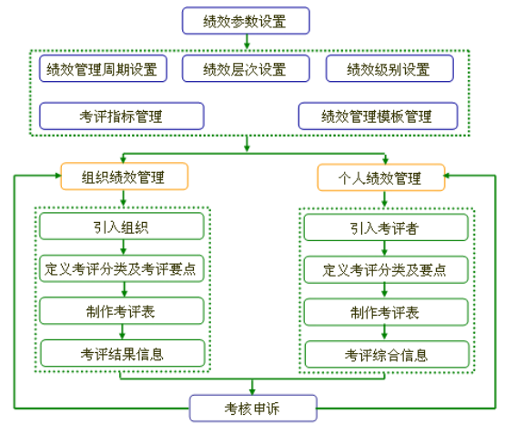 ● 組織績效考評包括引入組織、定義考評分類及考評要點、制作考評表,查看考核信息;