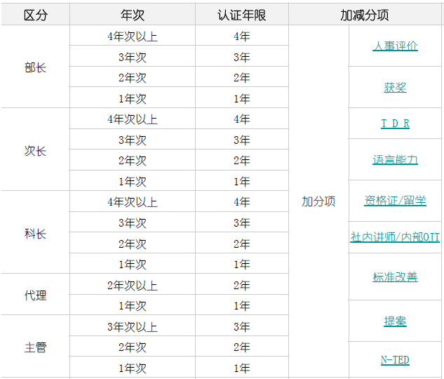 3.定義了七個(gè)職級(jí)的任職審核年限標(biāo)準(zhǔn),每個(gè)職級(jí)劃分為1年、2年、3年、4年及4年以上的認(rèn)證年限,并定義了每個(gè)職級(jí)的加減分項(xiàng):人事評(píng)價(jià)、獲獎(jiǎng)、TDR、語(yǔ)言能力、資格證/留學(xué)、社內(nèi)講師/內(nèi)部OJT、標(biāo)準(zhǔn)改善、提案、N-TED等方面的考核加減分項(xiàng);對(duì)必要資格定義如下:革新學(xué)校結(jié)業(yè)(在職期間需通過(guò)1次即可),且為學(xué)校結(jié)課時(shí)排名為參與人員的前10%,加分處理為第1名:0.1分;第2名:0.05分;而科長(zhǎng)升為次長(zhǎng):TOPIK需要2級(jí)以上;次長(zhǎng)升部長(zhǎng):TOPIK需3級(jí)以上;附圖為任證年限標(biāo)準(zhǔn):