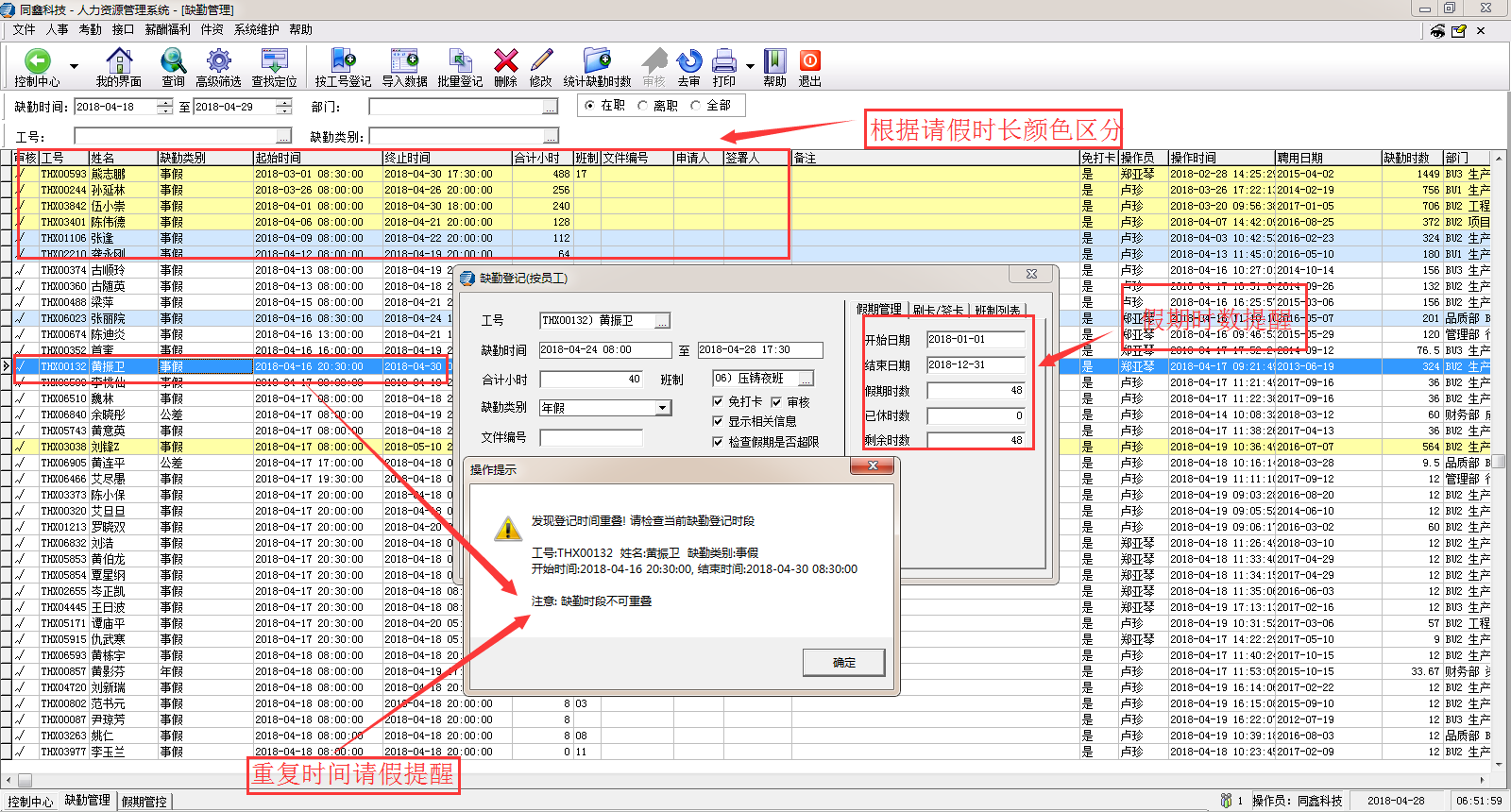 2、在請假控制方面,可以根據(jù)員工的請假時(shí)長設(shè)定不同的顏色進(jìn)行區(qū)分,同時(shí)針對于不同的請假類別以及重復(fù)的請假輸入進(jìn)行控制,做到防呆提醒功能,以減少HR管理者請假事務(wù)性工作的出錯(cuò)率。